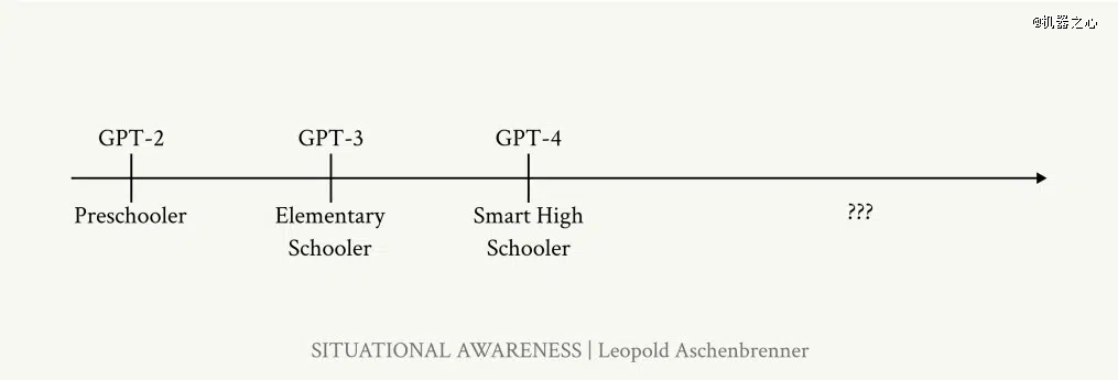 在文章中,作者探讨了近年来 AI 能力的指数级增长,尤其是 GPT-2 到 GPT-4 出现的过程。Leopold Aschenbrenner 强调,这是一个快速进步的时代,人工智能从完成非常基础的任务发展到拥有更复杂、类似人类的理解和语言生成能力。