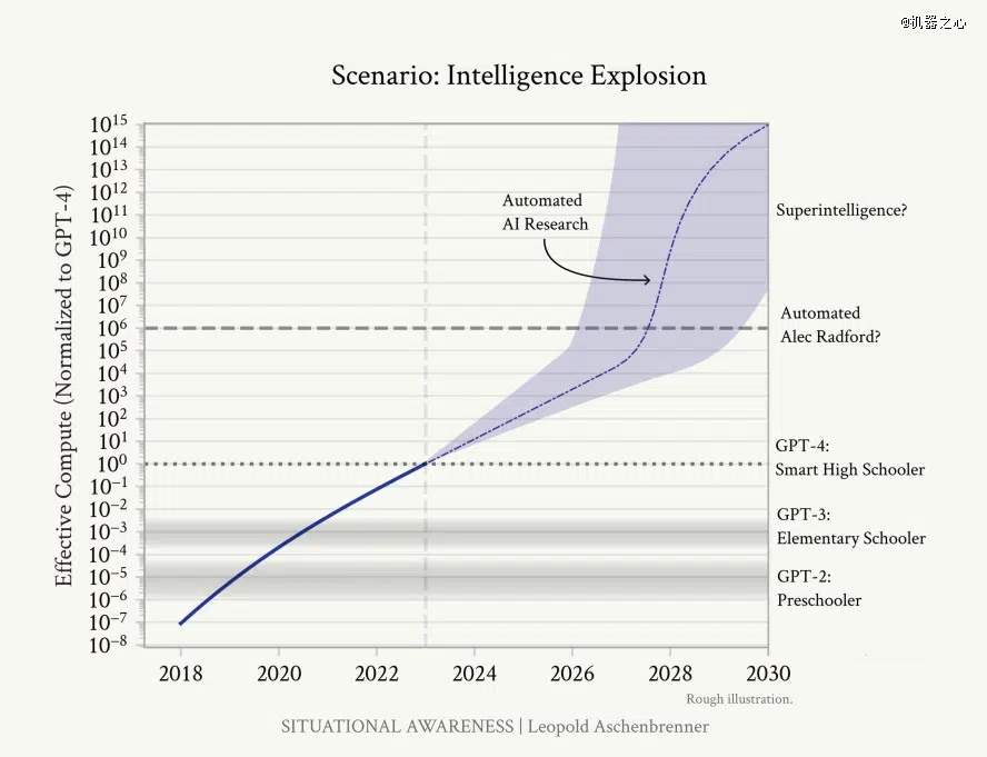 Aschenbrenner 在文中探讨了超级智能的概念,以及从如今 AI 快速过渡到远超人类认知能力的系统的可能性。该论点的核心思想是,驱动 AI 进化的原理可能会产生一个反馈回路,一旦达到人类水平,其智力就会爆发式增长。根据「智能爆炸」的概念,AGI 可能会自行开发算法和技能,它们能够比人类研究人员更快地完善自身设计。这种自我完善的循环可能会带来智力的指数级增长。