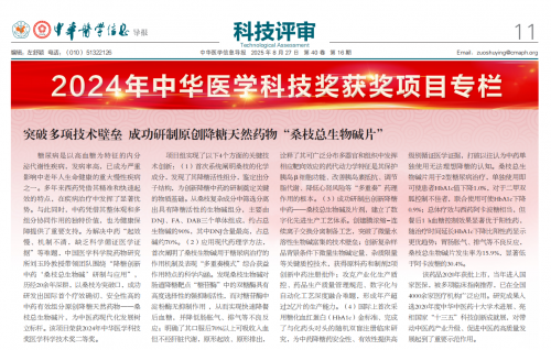 近日,由中国医学科学院药物研究所、中国医学科学院北京协和医院、北京五和博澳药业股份有限公司及广西五和博澳药业有限公司联合完成的降糖原创药“桑枝总生物碱”研制与应用项目,从数百项科技成果中脱颖而出,荣获“中华医学会医学科学技术奖”。8月27日,《中华医学信息导报》推出专栏,深度聚焦这一突破性成果。