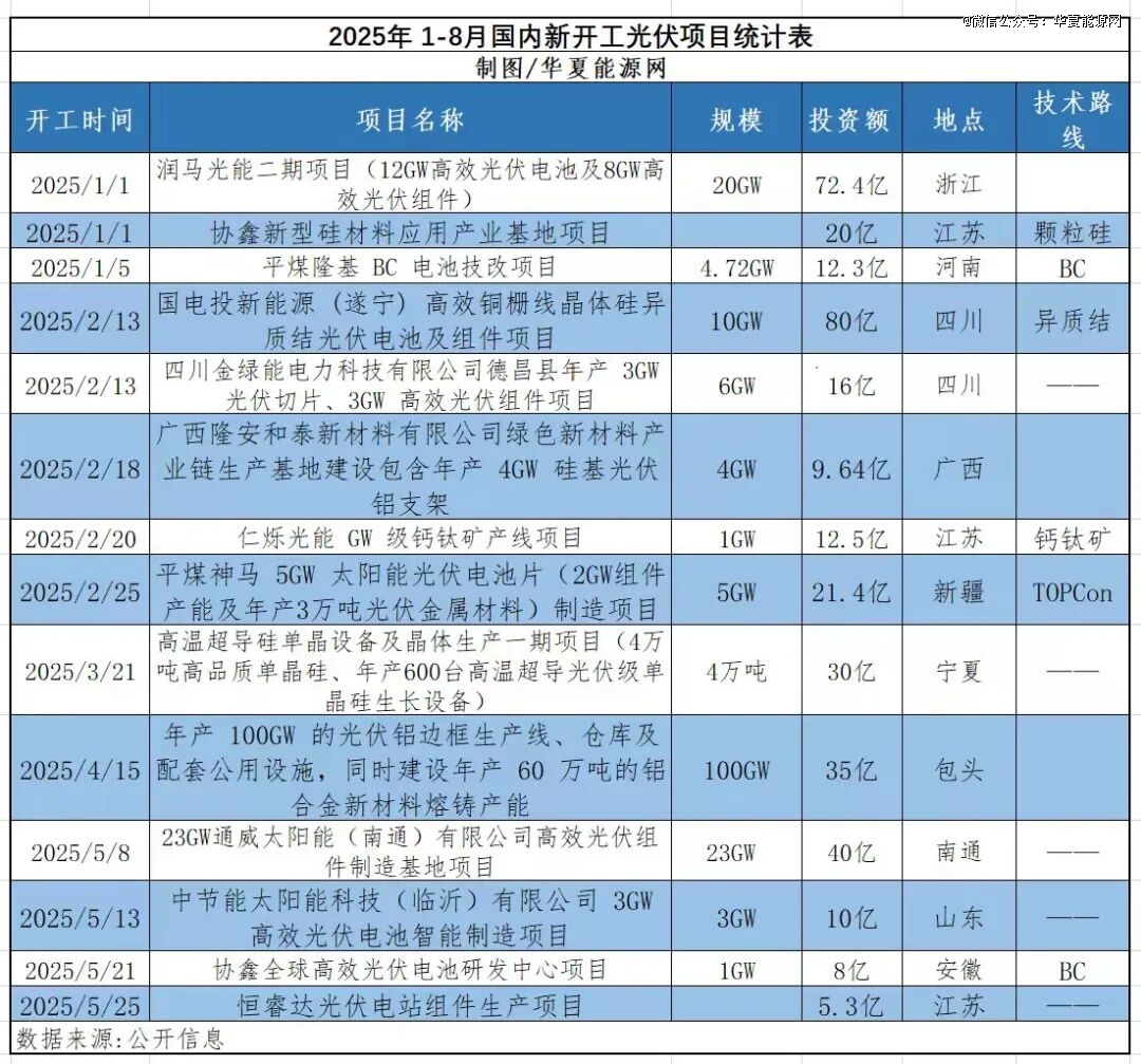 华夏能源网(公众号hxny3060)粗略统计,从今年年初至8月20日,国内新增拟上马和新开工光伏项目共计46个,涉及产能超237GW,投资总额超800亿元。