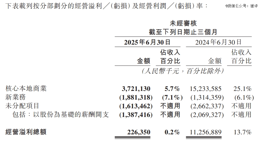 核心本地商业模块经营溢利同比下降 75.6% 至人民币 37 亿元,经营利润率同比下降 19.4 个百分点至 5.7% 。