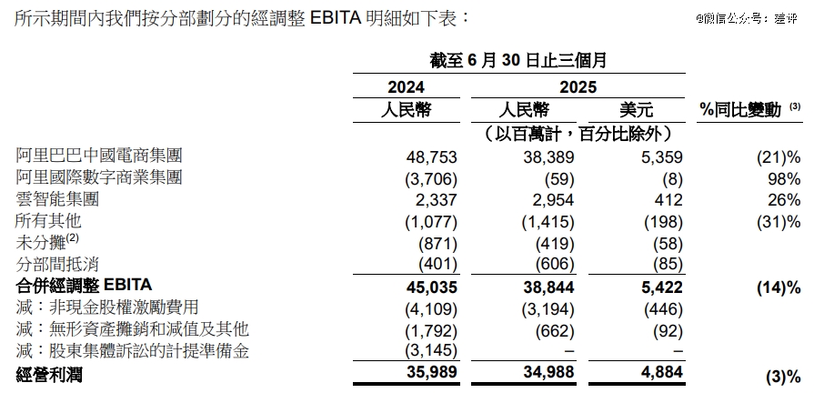 作为集团利润核心的 “ 阿里巴巴中国电商集团 ”,经调整 EBITA 同比下降 21% 至 384 亿元。