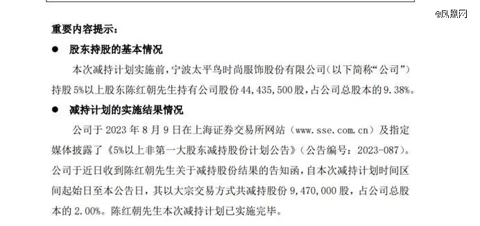 离职前,陈红朝持有太平鸟9.38%的股权,是公司第二大股东。更引发市场关注的是,陈红朝在离职后开启了减持计划。