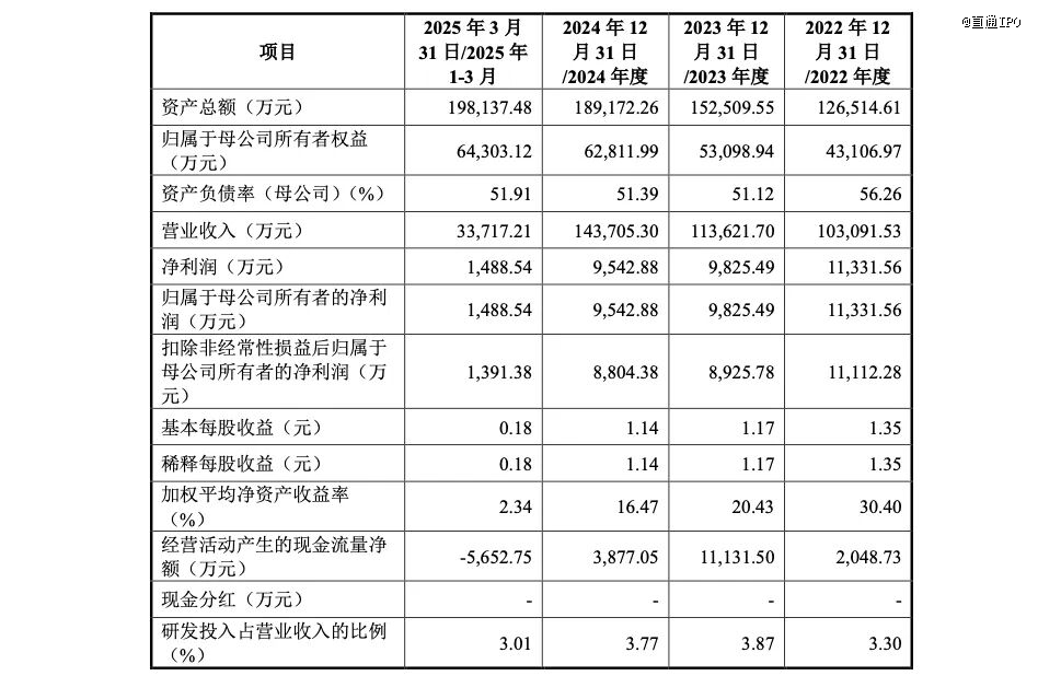 报告期内,纳百川的营业收入分别约10.31亿、11.36亿、14.37亿、3.37亿元;净利润和归母净利润一致,分别约1.13亿、9825.49万、9542.88万、1488.54万元,扣非归母净利润分别约1.11亿、8925.78万、8804.38万、1391.38万元;研发费用分别为3406.96万、4394.05万、5411.17万、1016.53万元,占营业收入的比例分别为3.30%、3.87%、3.77%、 3.01%。