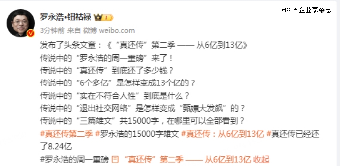 去年8月,罗永浩发布微博《“真还传”第二季——从6亿到13亿》回应债务情况,声称到目前为止一共还了8.24亿元,还剩余5亿多的债务,会继续努力还债。