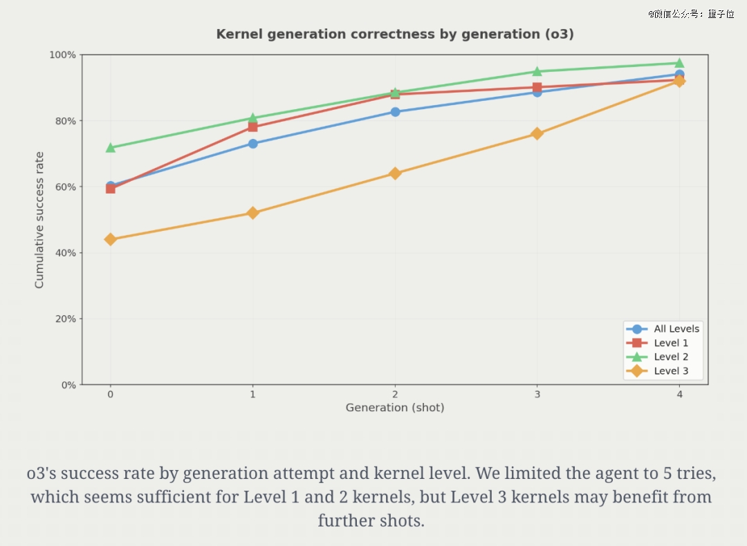 实验表明,正确性会随着尝试次数的增加而提升。以o3为例:*次尝试就有约60%的概率得到可用实现,到第5次尝试时可用实现比例达到94%。
