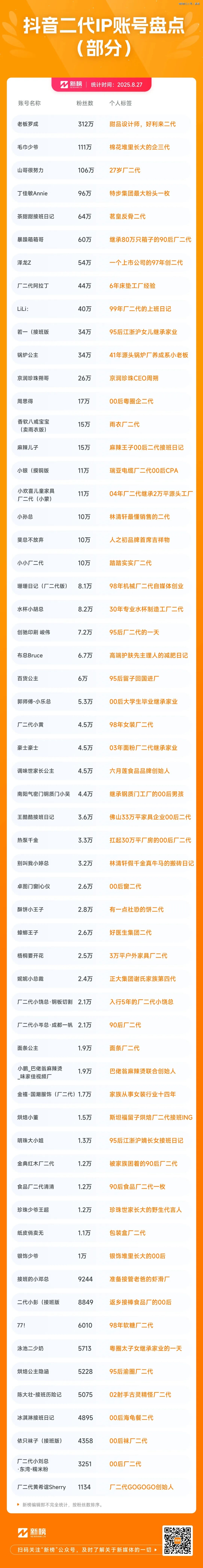 近日,新榜编辑部不完全统计了抖音上粉丝数较多的60个二代账号,并和多位二代聊了聊,试图挖掘二代集体做网红背后的故事。