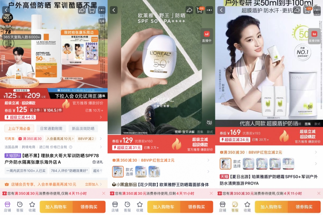 新一批大一新生即将开始的军训也被一众头部防晒品牌争夺,比如欧莱雅野王防晒、理肤泉大哥大防晒、珀莱雅护盾防晒等产品,誓将05后年轻用户收入囊中。