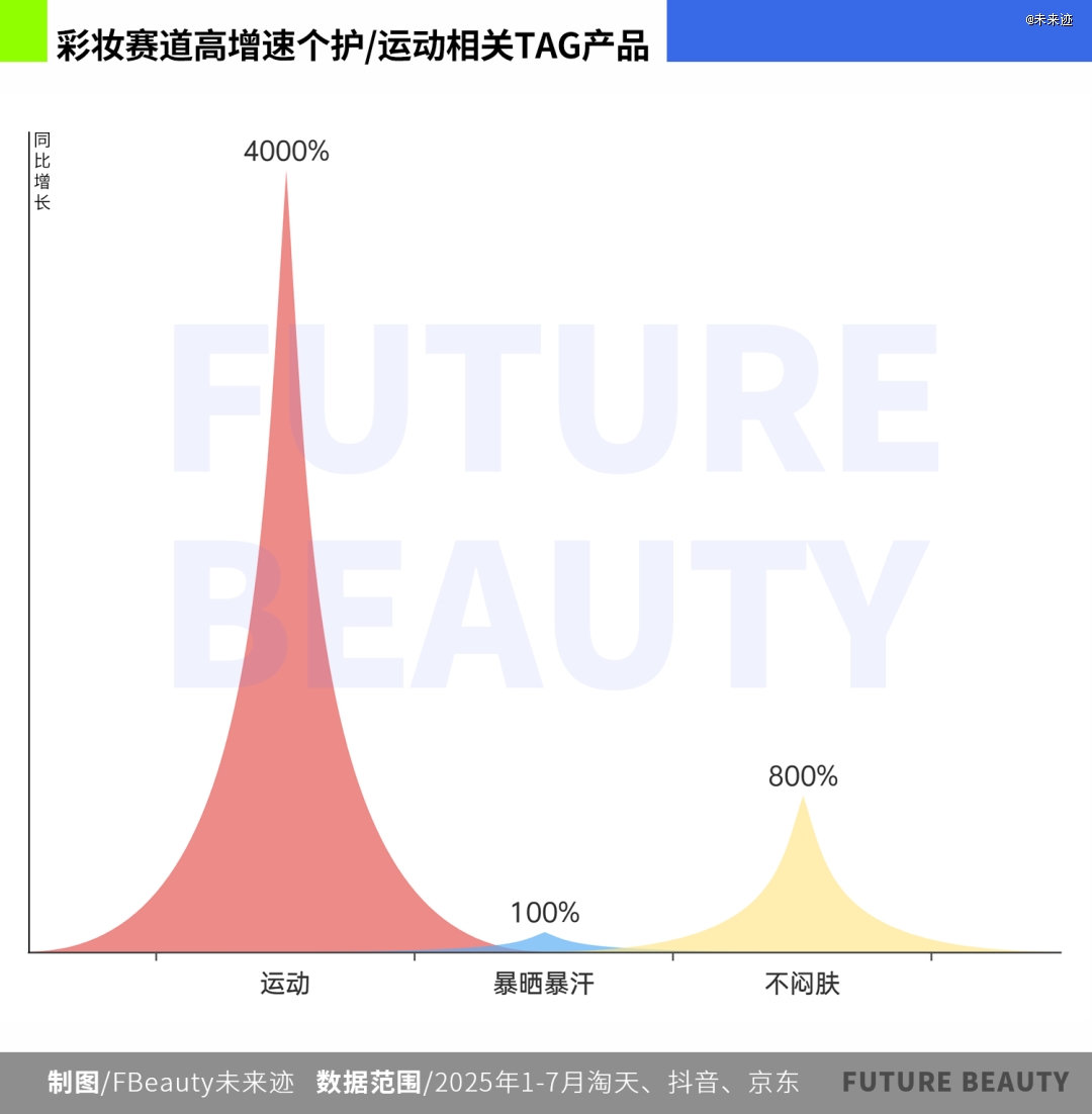 《FBeauty未来迹》数据显示,2025年前7个月(淘天、京东、抖音),带有“户外、运动”相关场景和需求tag的产品,分别在防晒&彩妆领域占了七成和六成体量。