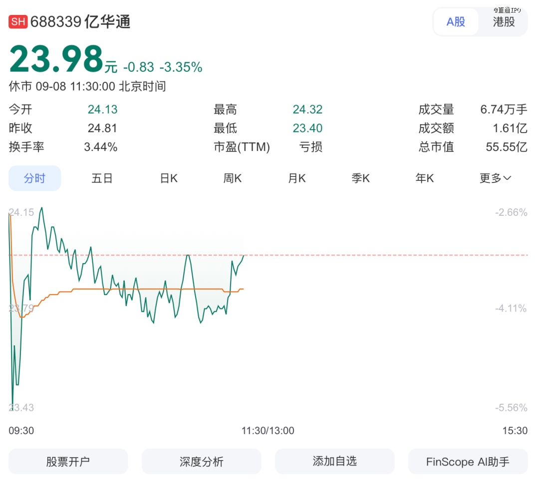 受并购终止、“较差”年中报等综合因素影响,截至午间休市,亿华通A股跌3.35%报23.98元/股,总市值55.55亿元;港股跌5.24%报23.50港元/股,总市值54.44亿港元。