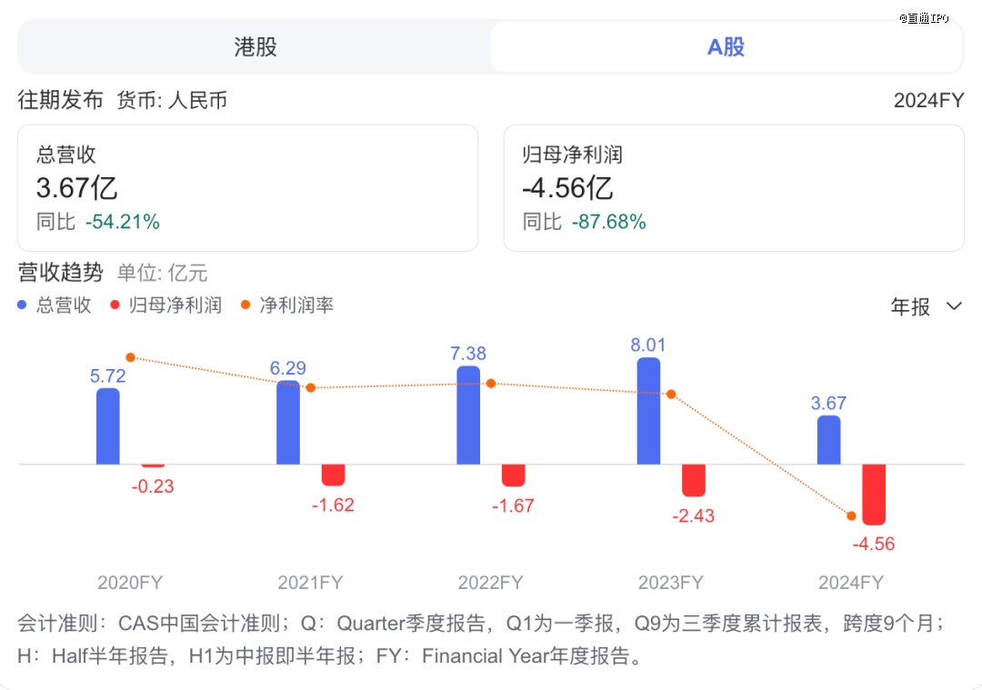 2020-2024年,亿华通的收入分别约5.72亿、6.29亿、7.38亿、8.01亿、3.67亿元;归母净利润分别约-2252.36万、-1.62亿、-1.67亿、-2.43亿、-4.56亿元。