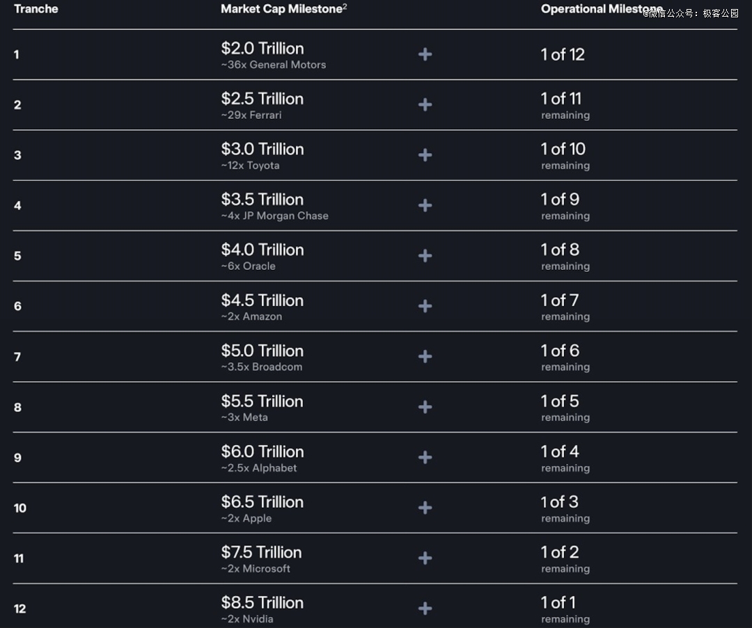 你可以把它想象成一场马斯克为自己量身定制的、难度堪称「地狱级」的闯关游戏。整个计划要在十年内完成,被分成了 12 个大关卡。每闯过一关,他才能解锁一部分股权奖励。