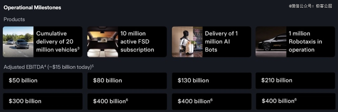 除了上述四大支柱,这个计划还绑定了一系列持续增长的 EBITDA(税息折旧及摊销前利润)目标,从 500 亿美元起步,直至惊人的 4000 亿美元。这确保了特斯拉在追求规模扩张的同时,必须保持强大的盈利能力和健康的现金流