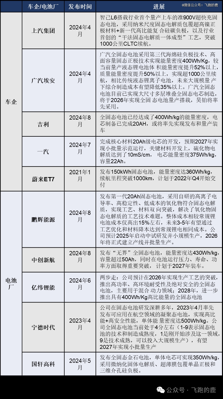 目前固态电池正处在“产业化竞速”阶段。2024 年智己 L6 首次搭载准 900V 快充固态电池,率先落地应用。随后广汽、吉利、一汽、上汽等车企,以及鹏辉、中航、亿纬、宁德、国轩等电池厂商纷纷加码,加速从实验室走向量产。整体上,聚合物、氧化物、硫化物三条路线并行,随着工艺和成本逐步优化,未来产业化路径将越来越清晰: