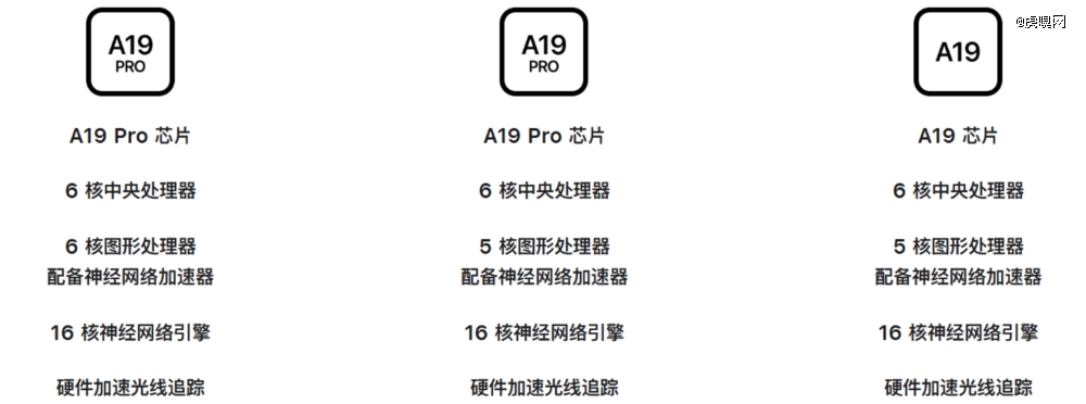 与前代iPhone相比,这次苹果将机型搭载的处理器进行更细致的划分:iPhone 17搭载基础版的A19芯片,iPhone Air搭载A19 Pro芯片,iPhone 17 Pro /Pro Max搭载A19 Pro(满血版)芯片,二者的主要差别是前者少了一个GPU核心。