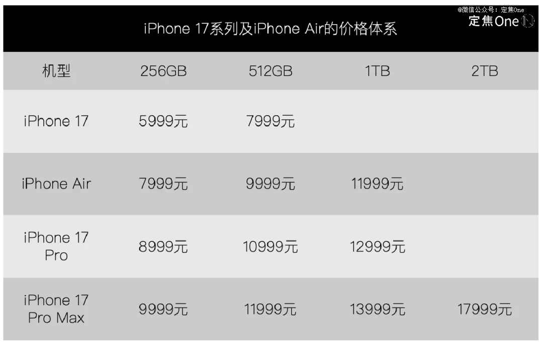 最后看定价,iPhone 17系列整体策略更精细:全系都从256GB起步,这算是一个实用的升级;Air系列7999元的起售价正好填补了标准版和Pro版之间的空白;Pro Max还新增了2TB版本,售价高达17999元,明显是针对专业用户的。