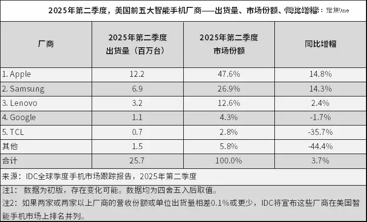 数据验证了这一点。IDC显示,2025年二季度,苹果在美国市场出货量增长14.8%,在前五名厂商中增速最快,份额稳居*(47.6%)。