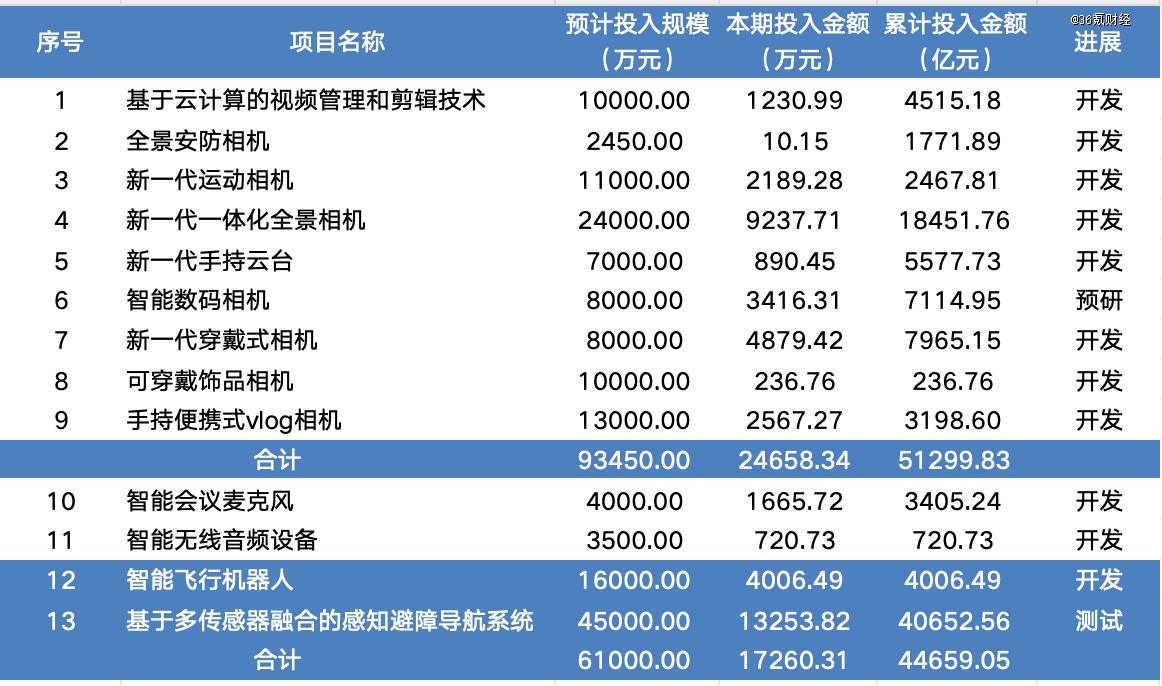 图:影石在研项目及投入 数据来源:公司半年报,36氪整理