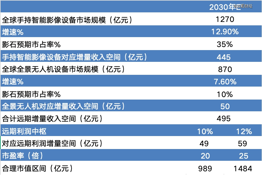 同时,假设2030年影石创新的综合市占率可以达到35%,由此计算,对应的远期收入空间为445亿元,加上全景无人机带来的50亿增量空间,合计收入空间约为495亿元左右。