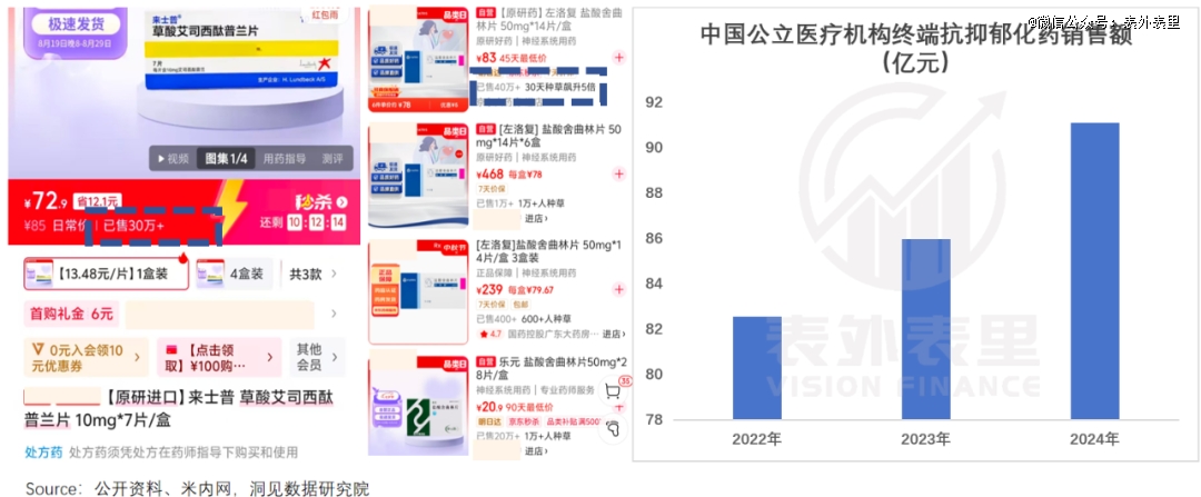 打开线上购物平台,常见抗抑郁药物销量以十万为单位,部分产品30天内种草飙升5倍。国内公立医疗机构终端抗抑郁化药销售额,也在去年创下超91亿元新高,同比增长6%。