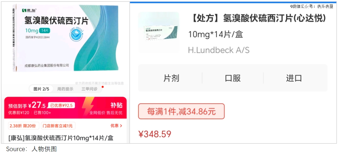 如今大雷打开购物APP,国产伏硫西汀价格已从500元打“骨折”至27.5元/盒,原研药的“皇冠”也松动,售价跳水40%。