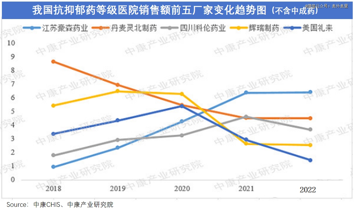 整体来看,随着多轮集采推进,抗抑郁药在等级医院销售TOP5厂家已重新洗牌,本土药企吞下了更多市场份额,豪森等企业逐渐占据*地位。