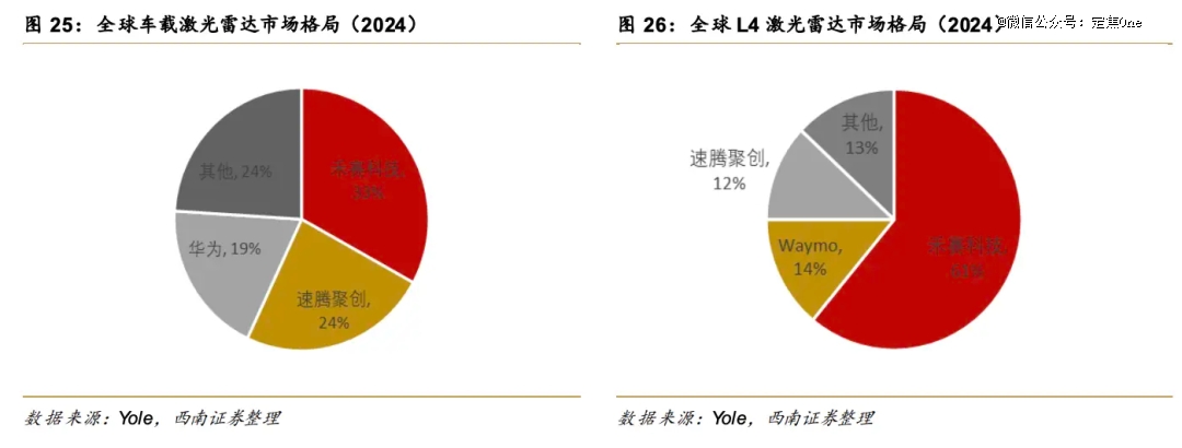 从市场地位看,禾赛确实底气较足。Yole Group数据显示,其在2021-2024年连续四年蝉联全球收入第 一。尤其是在高价值的L4自动驾驶市场中,禾赛份额高达61%,连续四年位居榜首,而速腾仅占12%。