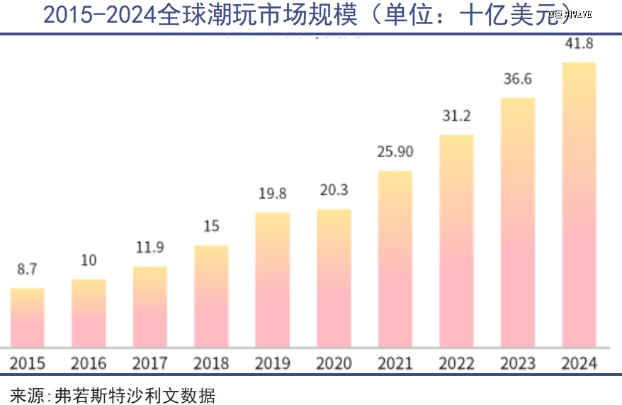 此后行业原创IP不断涌现,更多参与者也纷纷进入该领域,全球潮玩市场规模不断扩容。潮玩逐渐成长为同时受到消费市场与资本市场关注的热门赛道。