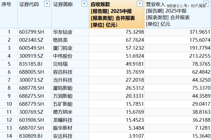 时代周报梳理发现,在2025年的中报中,包括容百科技、当升科技、五矿新能、万润新能、德方纳米等在内的多家正极材料厂商,其应收账款占营业收入的比例均超过40%。