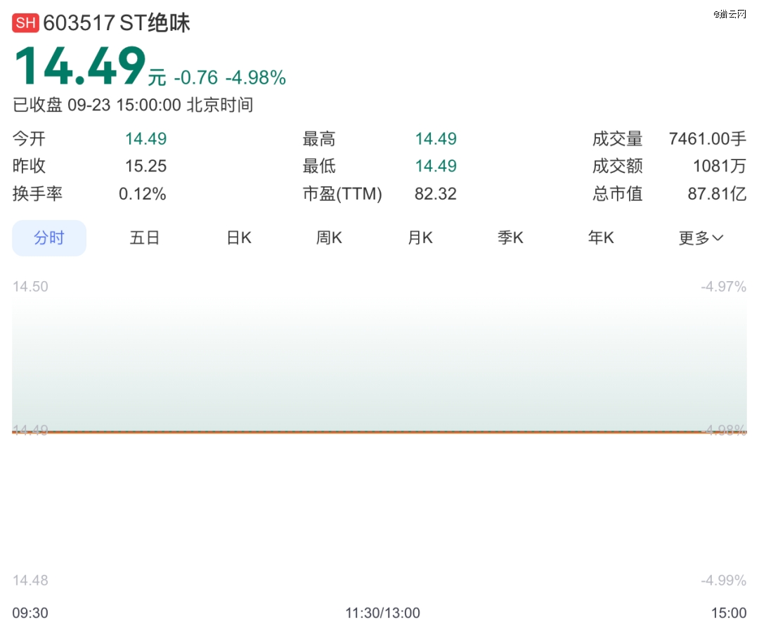 9月23日,绝味食品股票简称变为“ST绝味”,开盘一字跌停,总市值87.81亿。