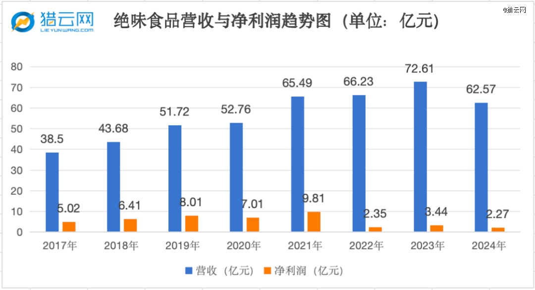 若再往前回溯,2024年,绝味食品迎来了上市以来的首次营收和净利润双降。其中,营收方面,2024年实现营业收入62.57亿元,同比下降13.84%,这是自2017年上市以来的首次营收下滑;净利润方面,2024年实现净利润2.27亿元,同比下降34.04%,业绩压力凸显。