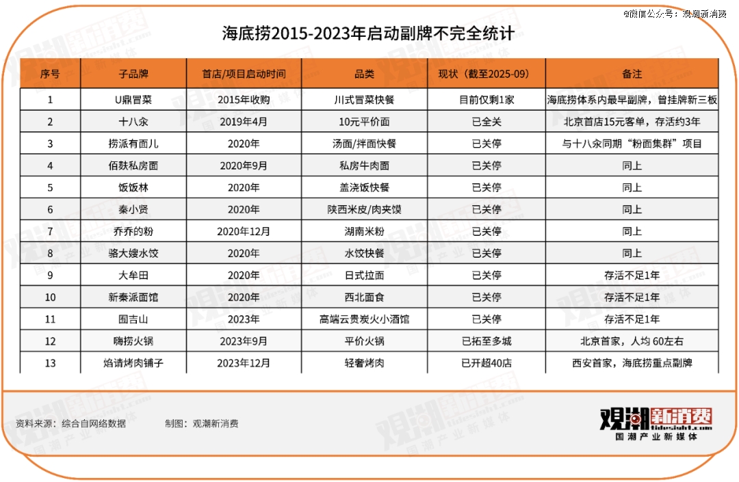 重大亏损促使海底捞重新审视副业节奏。海底捞先是暂时放缓了副业探索,关停大批子品牌,然后把精力聚焦在主品牌上。公开资料显示,海底捞在2023年推出过仅3个子品牌,分别是囿吉山、焰请烤肉铺子和小嗨火锅(原嗨捞火锅)。