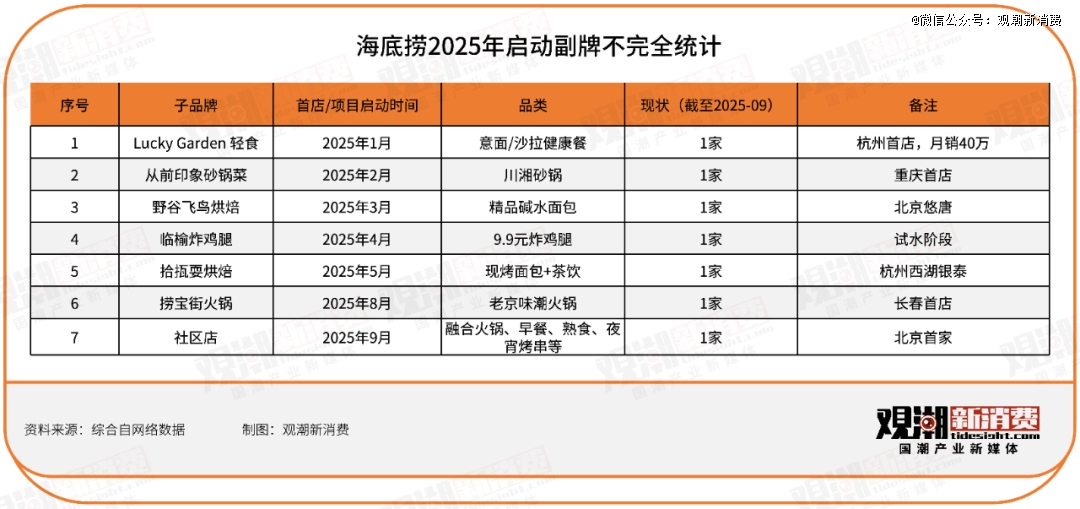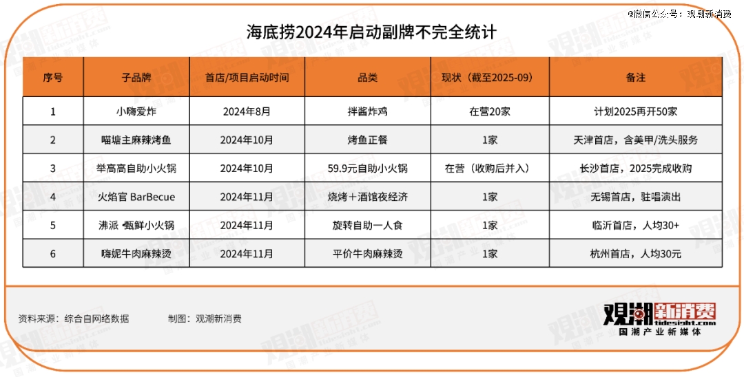 “红石榴计划”下,海底捞接连推出了小嗨爱炸、喵塘主麻辣烤鱼、举高高自助小火锅、火焰宫BarBecue、沸派·甄鲜小火锅、嗨妮牛肉麻辣烫等6个子品牌,其中举高高自助小火锅为收购而来。