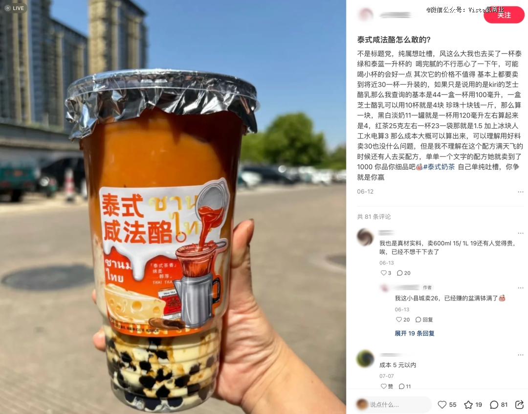 不过也有网友吐槽:“都说用的Kiri酪乳,还以为是什么高端食材,结果上网一搜是含乳饮料,二三十块钱就能买一升,结果一杯中杯的咸法酪就敢卖我25元。”