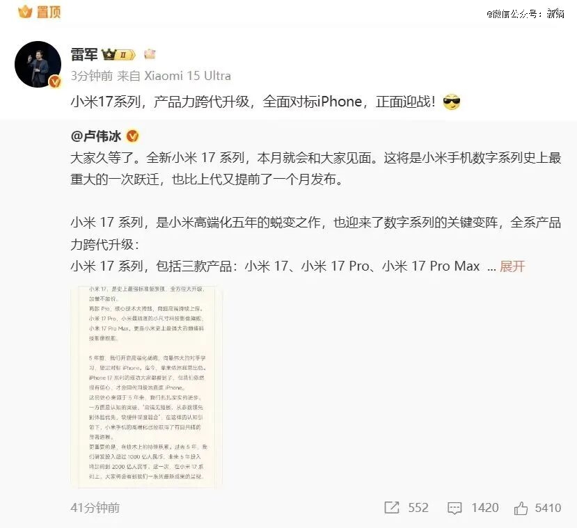 首当其冲的是小米。在苹果发布会5天后,小米集团总裁,手机部总裁,小米品牌总经理卢伟冰发文称,全新小米17系列将在本月发布。随后,雷军转发并称:小米17系列,产品力跨代升级,全面对标iPhone,正面迎战。