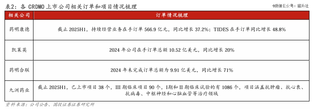 但CXO之中仍有景气度拐点来临,估值尚在低位而且爆发力很强的环节,那便是CDMO。可以看到,药明康德、药明合联、凯莱英和九洲药业的2024年底或2025H1的一些订单情况,过去一过性的订单影响消除之后,这些行业选手在手订单增长的状况能够明确公司未来业绩高速增长的先行指引。