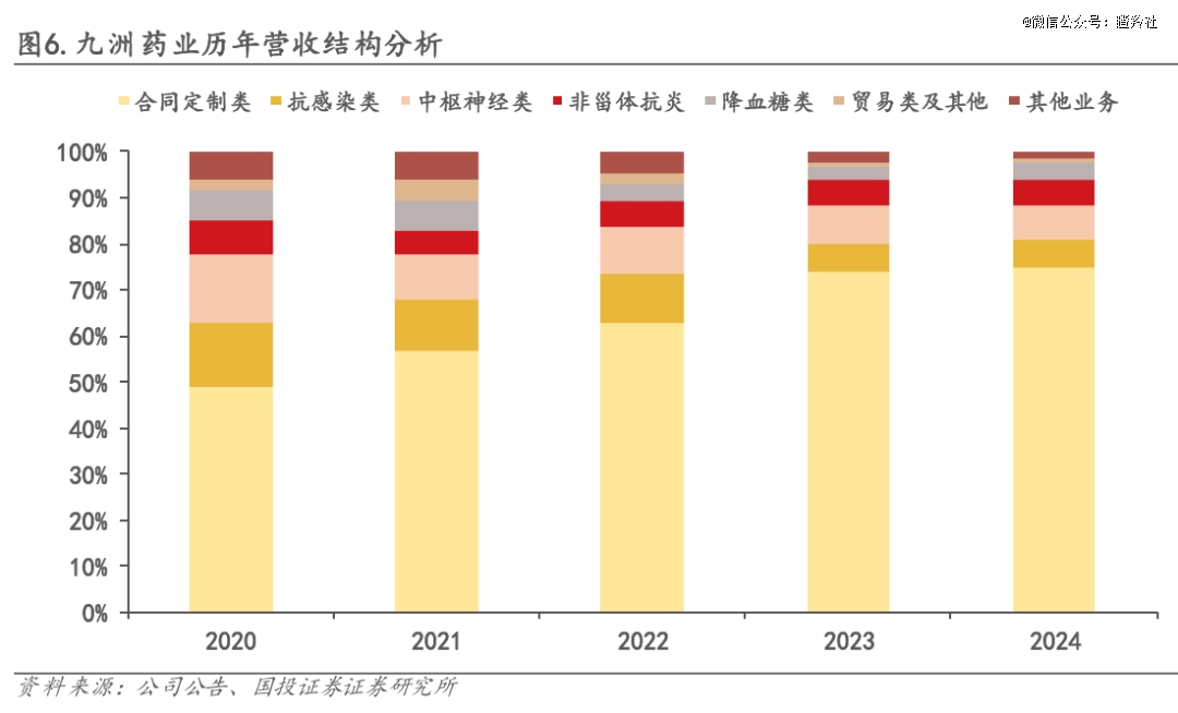 从营收拆分来看,原料药中间体业务的疲软一直是拖累九洲药业业绩高速增长核心影响因素,就拿2023-2024年公司收入利润增长疲软期来看,2024年公司抗感染类药物、中枢神经类药物、非甾体类抗炎药物和降血糖类药物业务较2022年收入和毛利润均呈现下滑趋势,CDMO(合同定制类业务)期间有波动但能维持较高的利润水平。