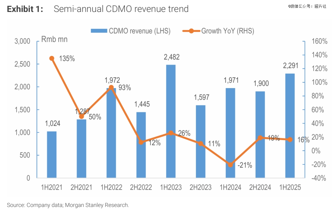 2025H1九洲药业CDMO收入22.91亿元(这一半年收入仅次于2023H1),同比增长16.3%,同时该业务占总营收比重已经迫近80%,创下了新高。