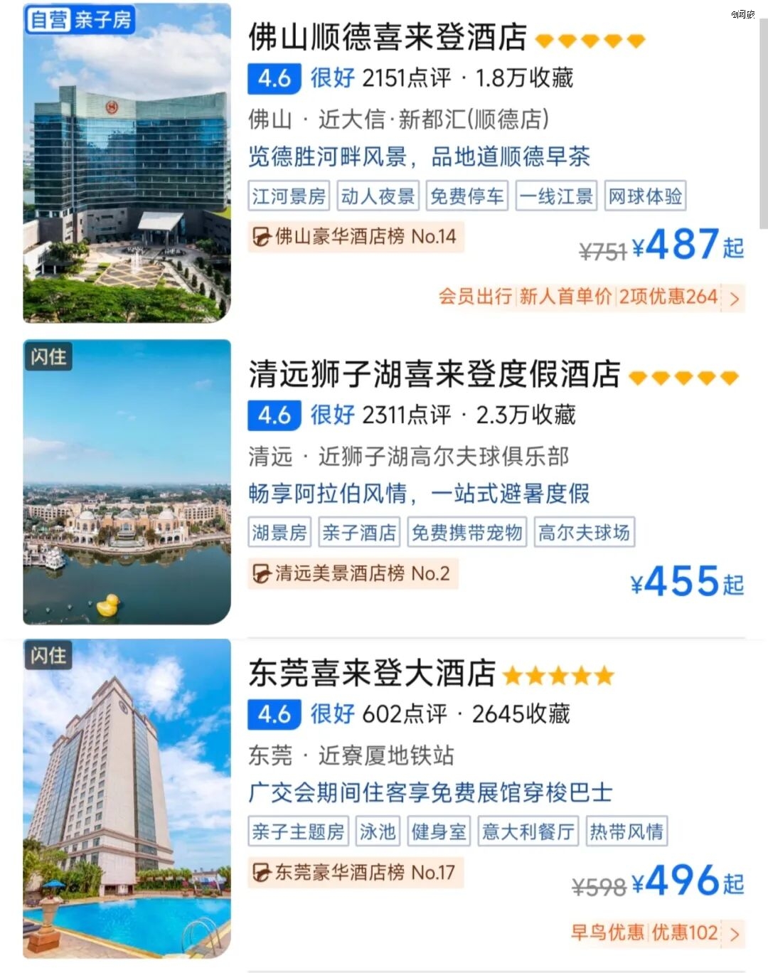 最近有网友发现,中山喜来登搞了个三天两晚套餐,才699块,算下来一晚上不到350,比同城的亚朵还便宜。不光这一家,佛山顺德喜来登487元起,惠州白鹭湖那家也才449起步,这价格放几年前谁敢信?