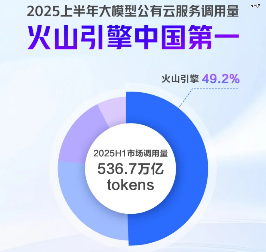 9月19日,国际数据公司IDC的《中国大模型公有云服务市场分析,2025H1》报告发布,IDC宣布,2025年上半年,中国公有云上大模型调用量达536.7万亿tokens。以该口径统计,火山引擎以49.2%的市场份额位居中国市场第 一。而阿里云、百度智能云市场份额分别为27%、17%,位列第二、第三位。