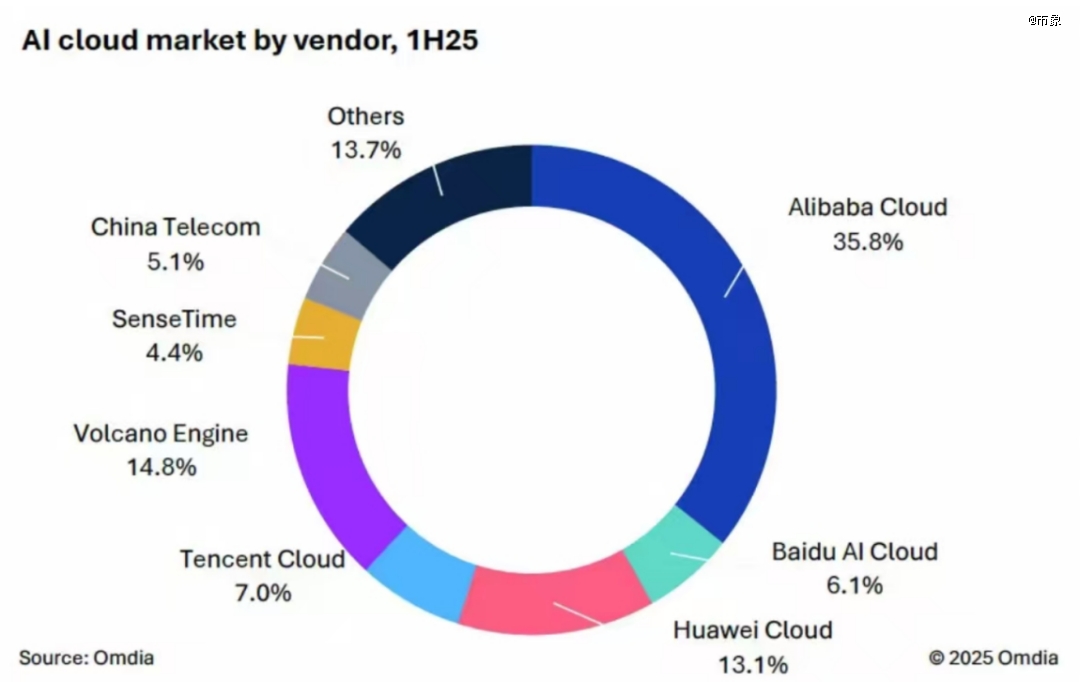 9月9日,国际市场调研机构英富曼(Omdia)发布的《中国AI云市场,1H25》报告显示,2025年上半年,中国AI云市场规模达223亿元,其中阿里巴巴占比达到35.8%,市场份额“断层第 一”。二到四名分别为火山引擎14.8%,华为云13.1%,腾讯云7%,百度云6.1%。