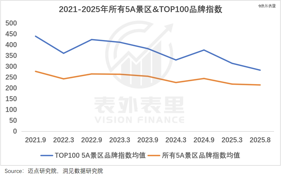 这在数据上,也有印证。可以看到,即将到来的国庆,“去哪人少”相关热度环比大涨200%,县一级宝藏小城冲上热门目的地;相比之下,最近4年,Top100 5A景区的品牌指数,已经腰斩了。