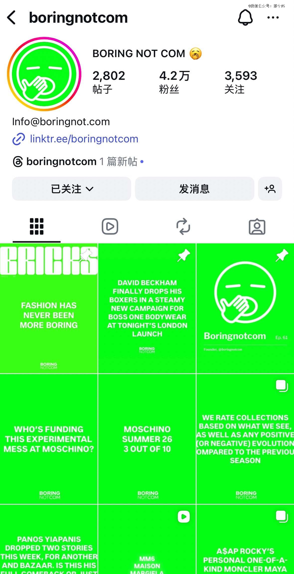 一个叫作@Boringnotcom的媒体专挑无聊的秀场,主页简直可汗大点兵