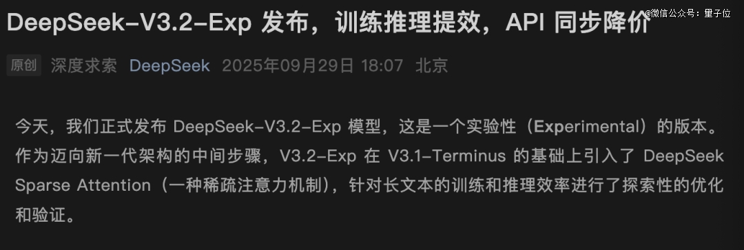 DeepSeek-V3.2-Exp刚刚官宣上线,不仅引入了新的注意力机制——DeepSeek Sparse Attention。