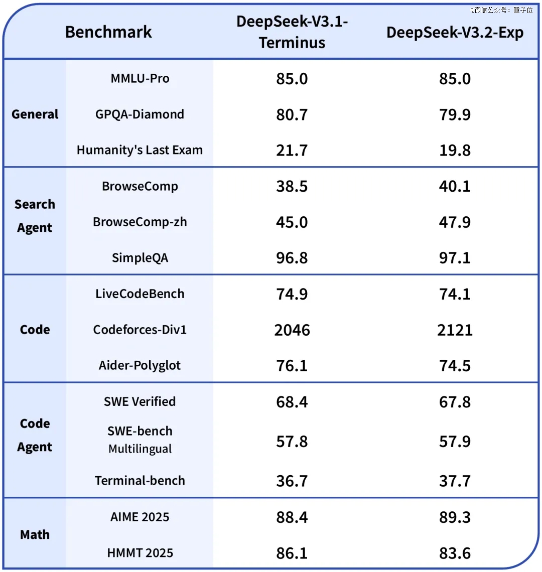 与前不久更新的DeepSeek-V3.1-Terminus对比,在各领域公开测评集上,DeepSeek-V3.2-Exp和V3.1-Terminus基本持平。