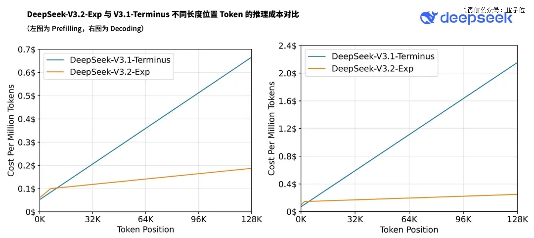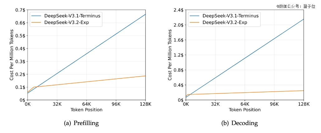 另外,论文提到,使用DSA的模型在处理128K长上下文时,推理成本显著低于DeepSeek-V3.1-Terminus,尤其在解码阶段。