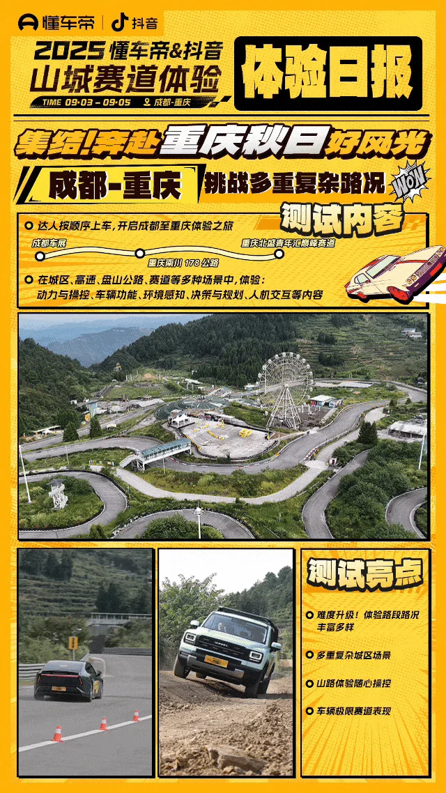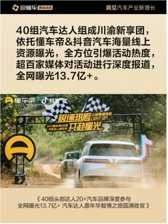 9月3日-9月5日,2025懂车帝&抖音汽车达人嘉年华智博之旅系列活动在重庆举行,以“极速热爱 共赴星光”为主题。活动正值2025世界智能产业博览会期间举行,深度结合汽车智能化趋势和重庆特色,通过山城落日派对、山城赛道体验、智博之夜直播专场等一系列线上线下活动,为品牌、达人与用户搭建深度对话的桥梁,共同开启汽车营销的新篇章。40组汽车达人组成“川渝新享团”,依托懂车帝&抖音汽车海量线上资源曝光,全方位引爆活动热度,超百家媒体对活动进行深度报道,全网曝光13.7亿+。