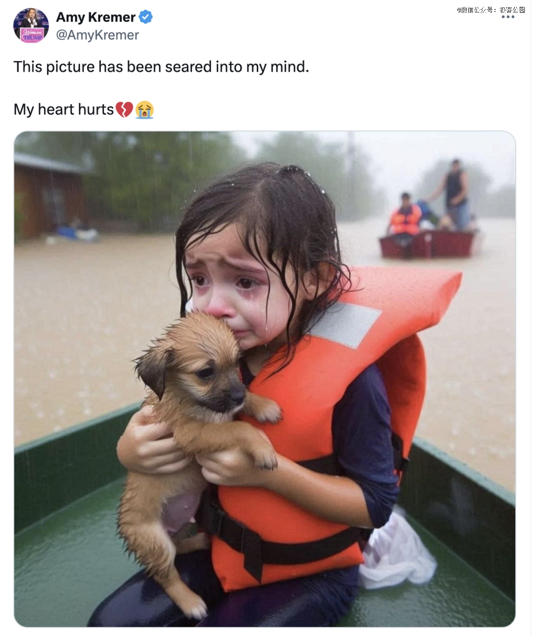 在去年「海伦妮」飓风席卷美国南部时,一张 AI 生成照片同时席卷了社交媒体。许多美国政客都亲自转发推文,传播量过百万。