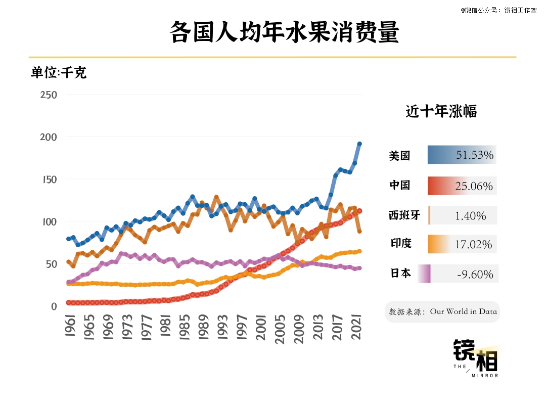 但由于过去贫瘠的物质条件,对很多人而言,吃水果是一种轻奢消费。在1961年,世界上每年人均水果消费量为37.5千克的时候,中国只有3.9千克,按每日建议量吃,仅仅够吃13天。