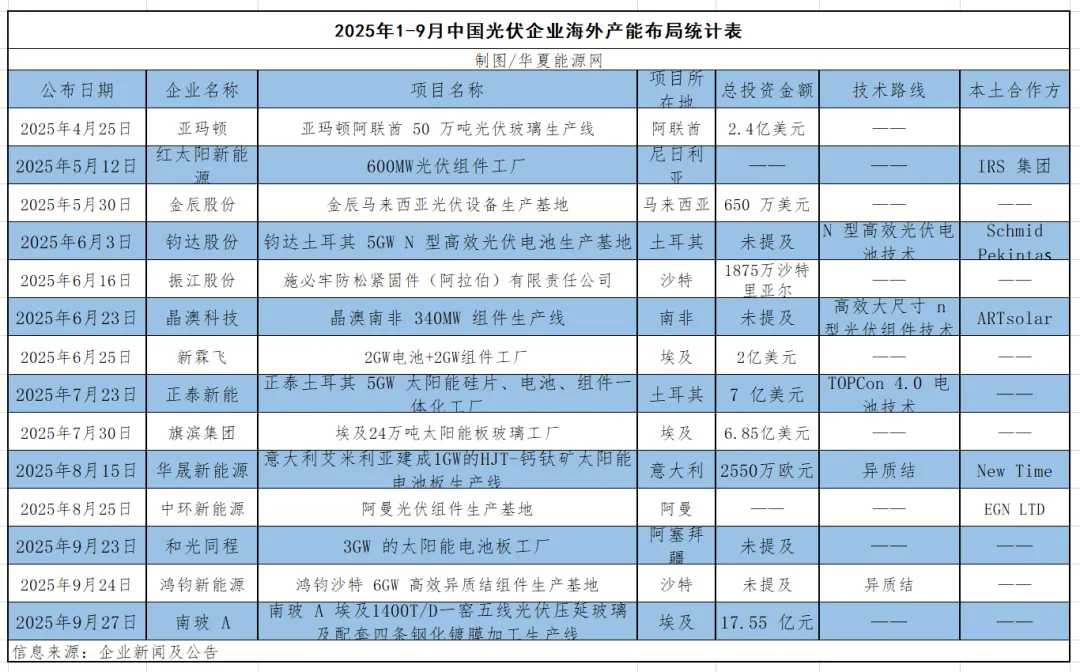 华夏能源网(公众号hxny3060)不完全统计,2025年以来至少有14家中国光伏企业公布在海外建厂计划,投资总规模近200亿元,中东及周边地区是最受青睐的出海热土。